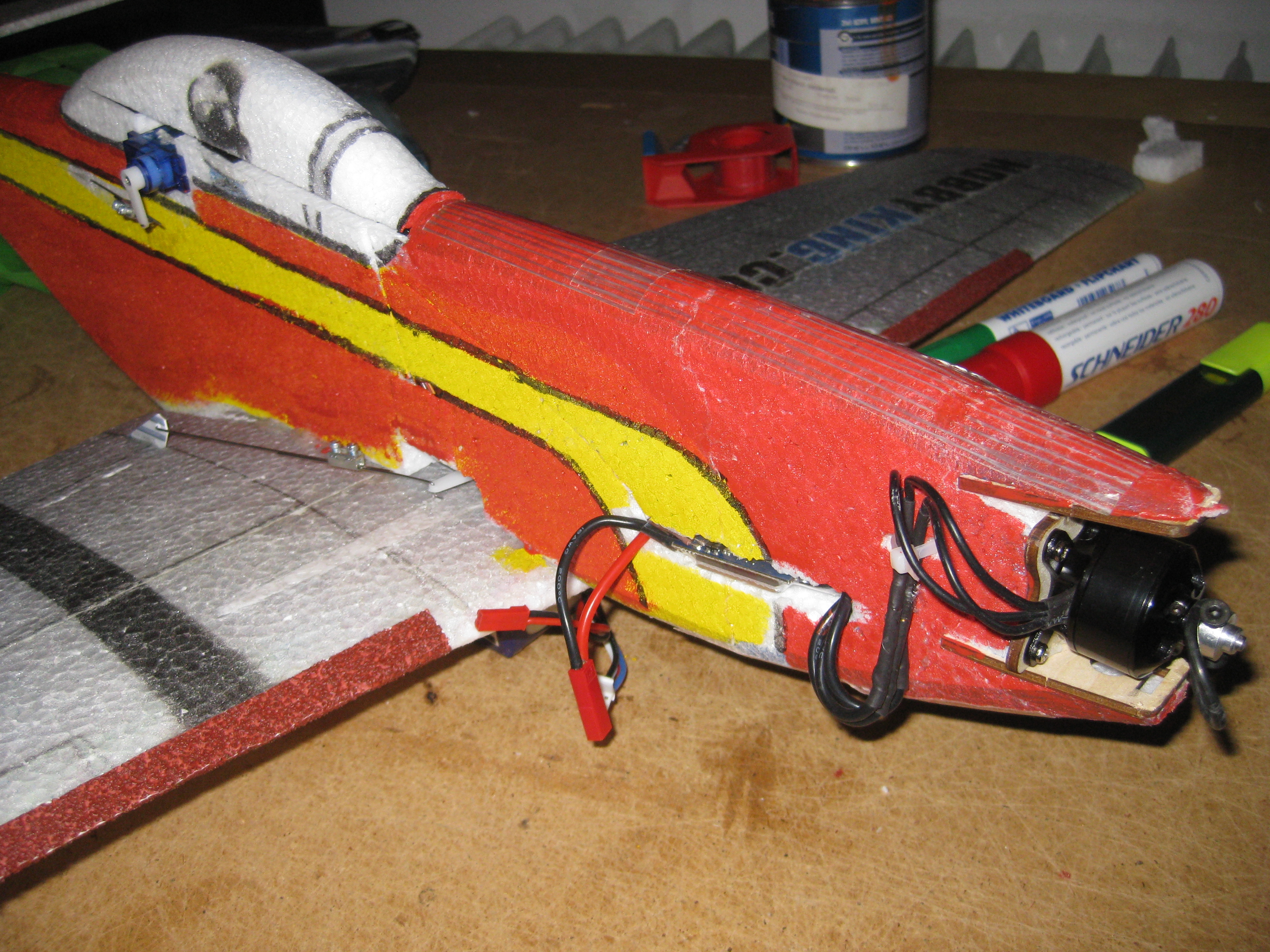Die Farbe auf dem Rumpf lässt sich prima mit einem Scheuerschwamm und Seife entfernen. Danach kann man den Rumpf gut nach eigenen Gutdünken gestalten. Der Prozess funktioniert leider nicht beim Flügel, Seitenleitwerk und Höhenruder. Da muss man überstreichen. Acrylfarbe auf Wasserbasis deckt dann ganz o.k. (siehe mein Seitenleitwerk ehemals blau -> nun rot).