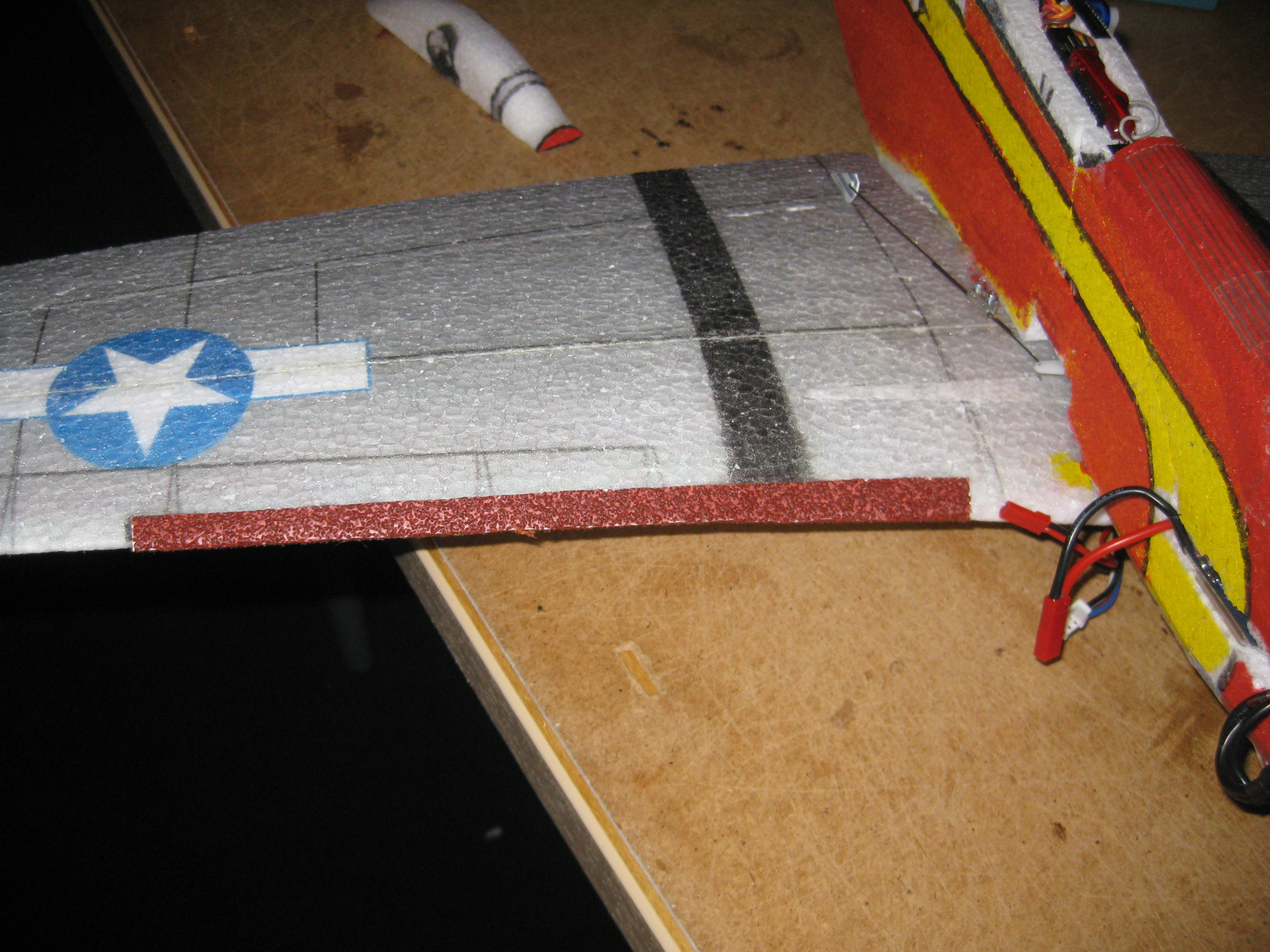 Auf der Länge einer DIN A4 Seite (gemessen vom Rumpf aus) wird ein zwei Zentimeter breiter Streifen Schleifpapier mit Körnung 40 angebracht (mit UHU Por ankleben).