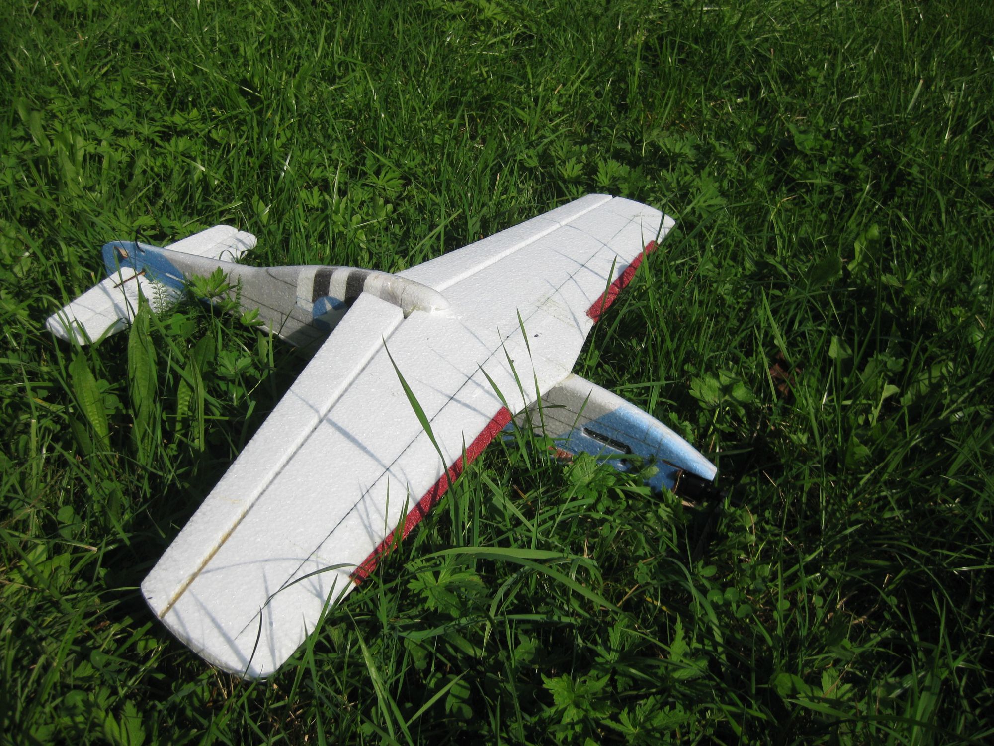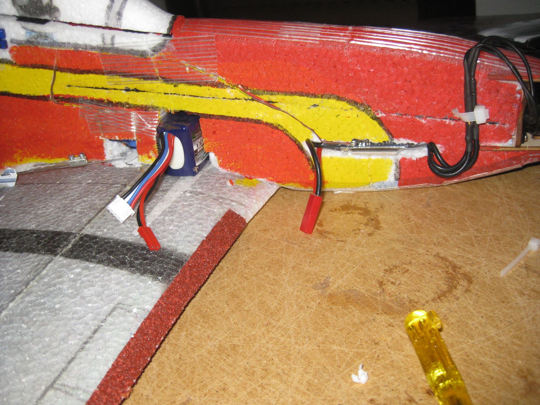Nachdem der Lipo bei Kollisionen in der Luft immer abgeworfen wurde, kann man ihn nun in den Rumpf einklemmen. An der Stelle saß bisher noch der Querruderservo. Praktischerweise hat der Lipo (Turnigy nanotec 3s850mA) genau in das Loch des 9gr Servos (Turnigy Tg9e) hineingepasst.