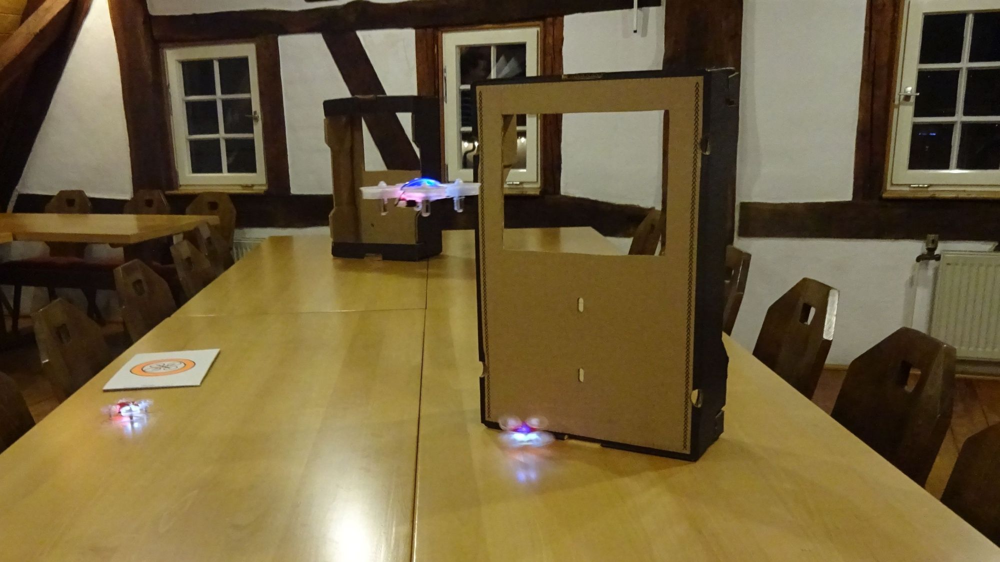 14.12.2016 – Indoor Quattrocopter Rennen Kommentar verfassen Unser erster Indoor Quattrocopterevent – die Startaufstellung und die Strecke: Ausschnitte aus der Streckenkamera vor einem der Hindernisse: